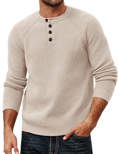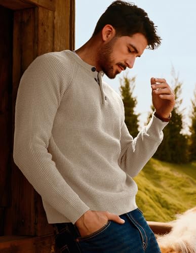 Mens Sweaters Casual Waffle Pullover Sweater Button Crewneck Textured Knit Henley Sweaters